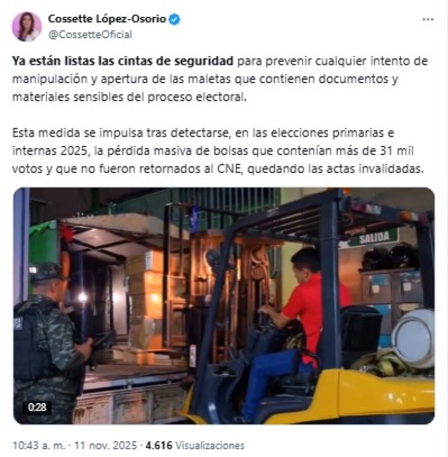 “Ya están listas las cintas de seguridad para prevenir cualquier intento de manipulación y apertura de las maletas que contienen documentos y materiales sensibles del proceso electoral”, escribió en sus redes sociales la consejera López Osorio.
