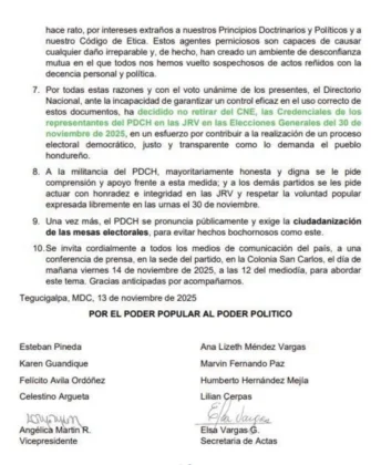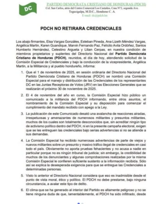 El comunicado detalla que el 1 de noviembre de 2025, en sesión ordinaria del Directorio Nacional del Partido Demócrata Cristiano de Honduras, se nombró una Comisión Especial para el manejo y distribución de las credenciales de los representantes de la DC en las JRV, en las elecciones generales que se realizarán el próximo 30 de noviembre.