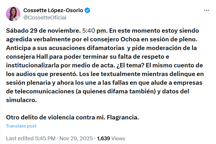 “En este momento estoy siendo agredida verbalmente por el consejero Ochoa en sesión de pleno. Anticipa sus acusaciones difamatorias y pide moderación de la consejera Hall para poder institucionalizar su falta de respeto por medio de acta”, escribió López, calificando lo ocurrido como un acto de violencia en flagrancia contra su persona.