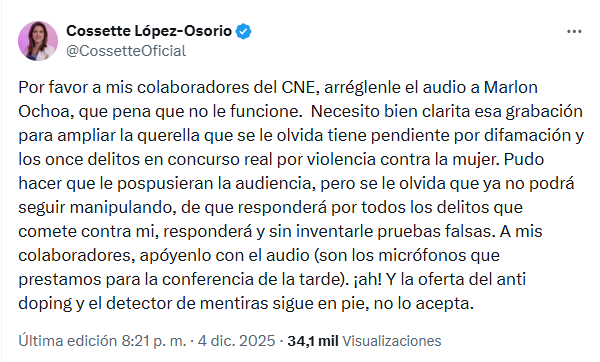 López indicó que necesita la grabación “bien clarita” para fortalecer la querella por difamación que mantiene contra Ochoa, así como por “once delitos en concurso real por violencia contra la mujer”.