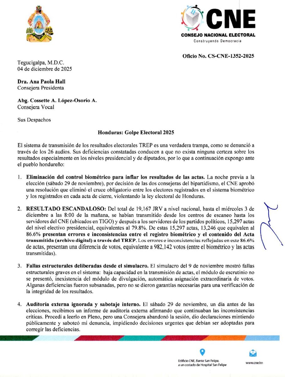 Tegucigalpa, Honduras. La consejera del Consejo Nacional Electoral (CNE), Cosette López, solicitó este jueves a los colaboradores de la institución mejorar la calidad del audio de la reciente conferencia ofrecida por el consejero Marlon Ochoa, con el fin de incorporarlo a un proceso legal en curso en su contra.