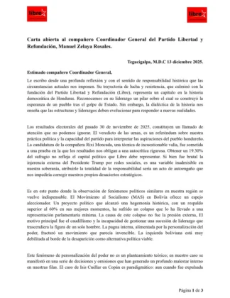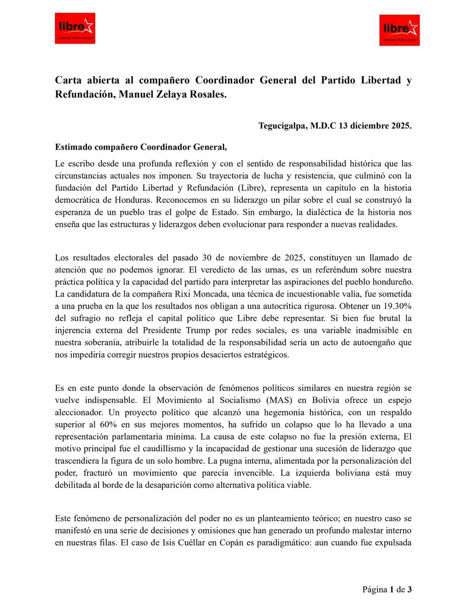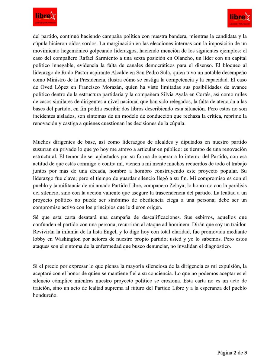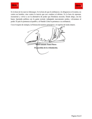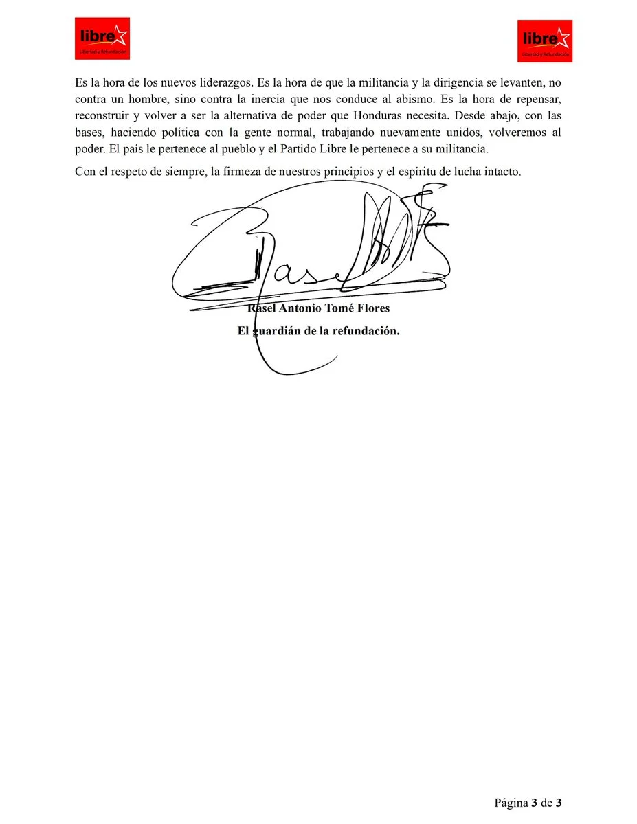 “Esta carta no es un acto de traición, sino un acto de lealtad suprema al futuro del Partido Libre y a la esperanza del pueblo hondureño”, concluyó Rasel Tomé.