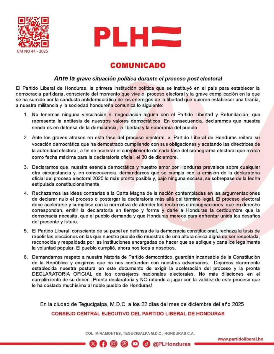 Tegucigalpa, Honduras. El Partido Liberal de Honduras (PLH) emitió este lunes un comunicado en el que fija su postura frente a los retrasos en el proceso electoral y rechaza haber tenido negociaciones con otros partidos políticos.