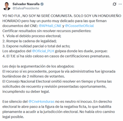 A través de su cuenta oficial de X, Nasralla cuestionó la actuación del órgano electoral al emitir la resolución de resultados a nivel presidencial. Señaló que dicha decisión podría constituir una violación y comprometer la legalidad del proceso.