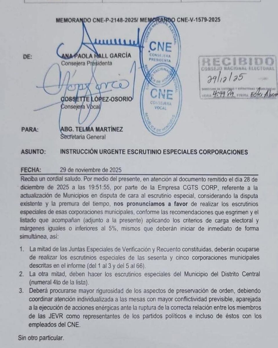 El memorándum, con asunto de instrucción urgente relativo al escrutinio especial de corporaciones municipales, fue enviado a la Secretaría General del órgano electoral.
