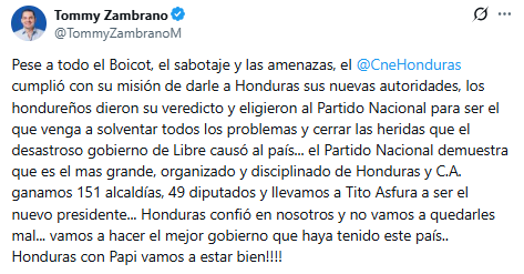 A través de su cuenta oficial en la red social X, el diputado nacionalista expresó: «Pese a todo el boicot, el sabotaje y las amenazas, el CNE cumplió con su misión de darle a Honduras sus nuevas autoridades».