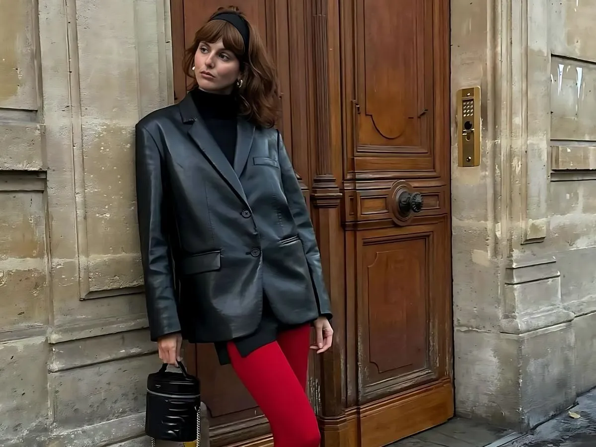Las medias rojas rompen la sobriedad del traje, y si buscas comodidad absoluta, unas bailarinas negras cerrarán el conjunto con un toque francés ideal para la Nochebuena.