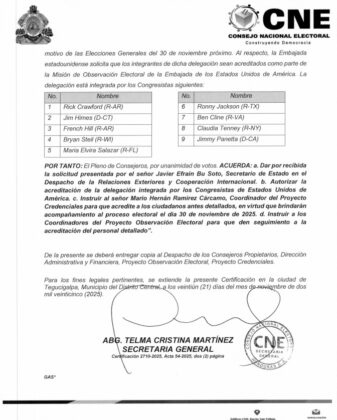 Redacción. Nueve congresistas estadounidenses participarán como veedores en las elecciones generales del 30 de noviembre, confirmó oficialmente con su voto el consejero del Consejo Nacional Electoral (CNE), Marlon Ochoa.