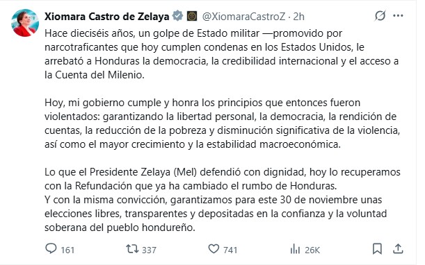 En un mensaje difundido en sus redes sociales, la mandataria recordó los hechos ocurridos en 2009 y señaló que aquel quiebre institucional dejó profundas consecuencias en la democracia hondureña.