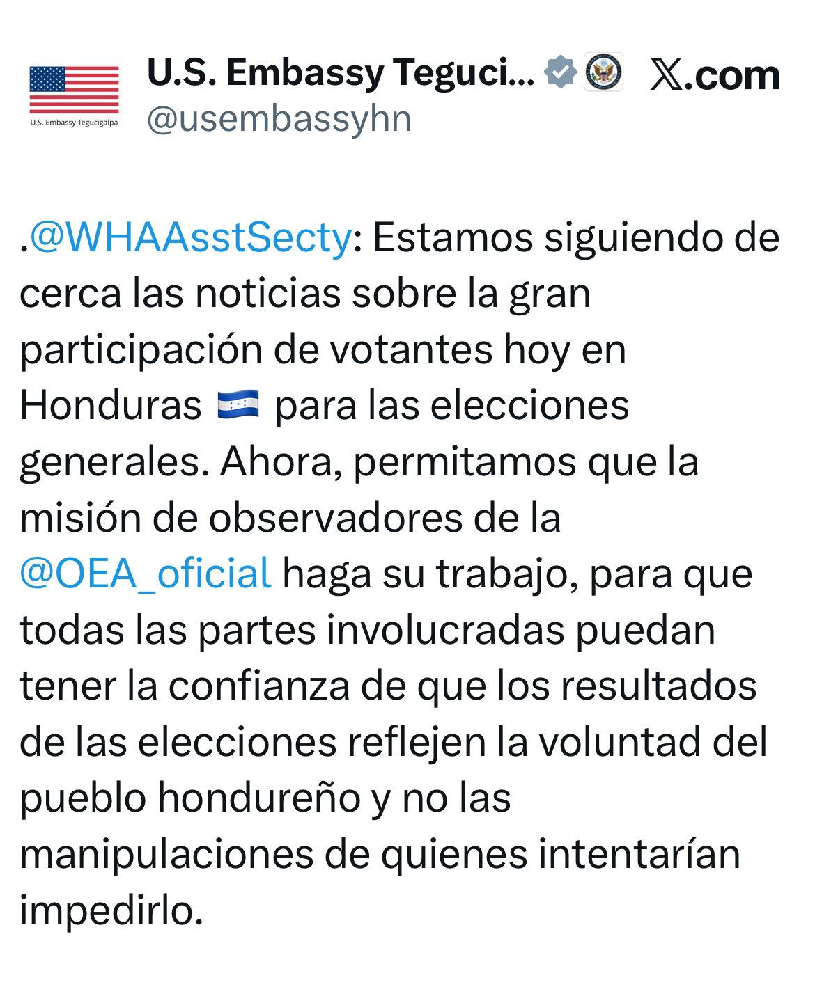 “La transparencia y la supervisión independiente son fundamentales para fortalecer la democracia en Honduras. Por ello, instamos a todos los actores políticos a colaborar y garantizar que los observadores de la OEA puedan cumplir con su labor sin obstáculos ni interferencias”, indicó la Embajada.