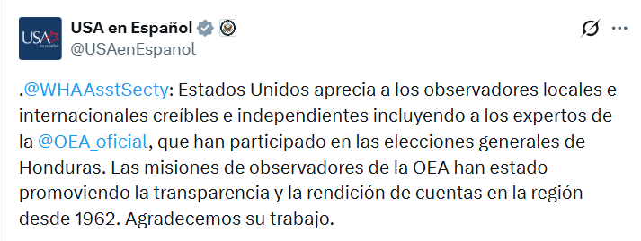 «Estados Unidos aprecia a los observadores locales e internacionales creíbles e independientes incluyendo a los expertos de la OEA, que han participado en las elecciones generales de Honduras», escribió.