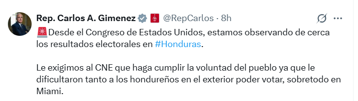 «Desde el Congreso de Estados Unidos, estamos observando de cerca los resultados electorales en Honduras. Le exigimos al CNE que haga cumplir la voluntad del pueblo ya que le dificultaron tanto a los hondureños en el exterior poder votar, sobre todo en Miami», escribió el legislador.