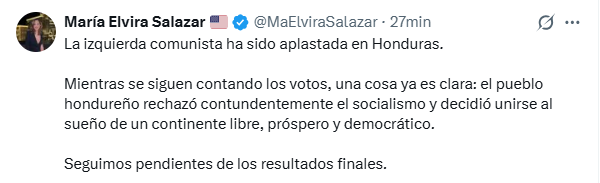 Redacción. La congresista estadounidense María Elvira Salazar reaccionó este domingo a los primeros resultados preliminares de las elecciones generales en Honduras, afirmando que “la izquierda comunista ha sido aplastada”.