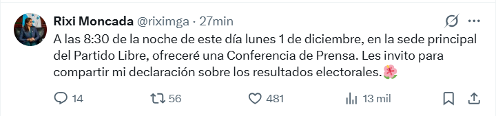 “A las 8:30 de la noche de este día lunes 1 de diciembre, en la sede principal del Partido Libre, ofreceré una Conferencia de Prensa. Les invito para compartir mi declaración sobre los resultados electorales”, escribió.