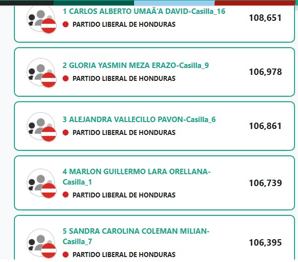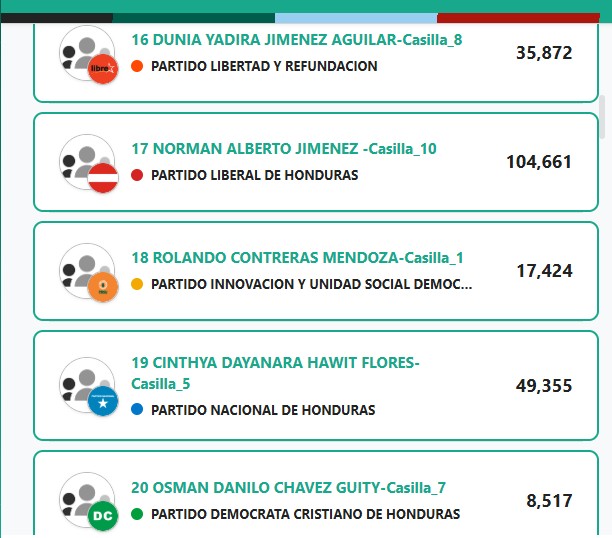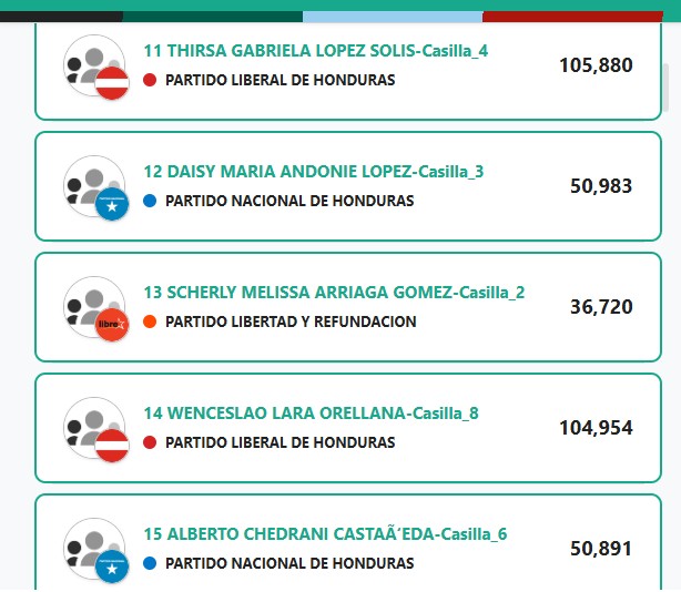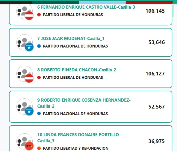 En segunda línea se ubica el Partido Nacional (PN), seguido por Libertad y Refundación (Libre). De esta manera, ambos partidos estarían logrando asegurar espacios competitivos dentro del listado.