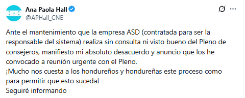«Ante el mantenimiento que la empresa ASD realiza sin consulta ni visto bueno del pleno de consejeros, manifiesto mi absoluto desacuerdo y anuncio que los he convocado a reunión urgente con el pleno. ¡Mucho nos cuesta a los hondureños y hondureñas este proceso como para permitir que esto suceda! Seguiré informando», escribió la presidenta del CNE.