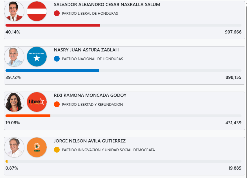 Los datos del órgano electoral sostenían que el candidato por el Partido Liberal, Salvador Nasralla, lideraba las elecciones con 907,666 votos y un porcentaje del 40.14 % de las actas contabilizadas.