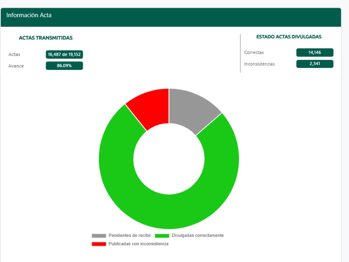 Según la información oficial del Consejo Nacional Electoral (CNE), hasta el último corte se registran 2,341 actas pendientes de revisión, mientras que se han procesado 16,487 de un total de 19,152, lo que representa un 86.9% del escrutinio.