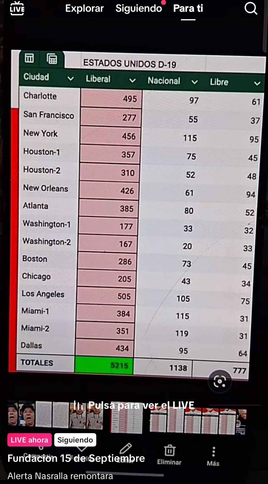 Durante una transmisión en vivo realizada por la Fundación 15 de Septiembre, su presidente, Juan Flores, presentó las cifras recopiladas centro por centro en el Distrito Electoral 19, correspondiente a Estados Unidos, donde, según lo mostrado en pantalla, Nasralla mantiene una amplia ventaja.