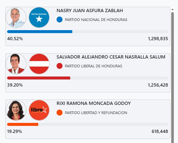 A pesar de los inconvenientes técnicos, el CNE también reportó los resultados preliminares hasta el momento. A las 3:00 p.m. de este miércoles, el presidenciable por el Partido Nacional, Nasry Asfura, lideraba con un total de 1,298,835 votos.