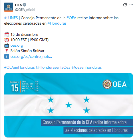 Redacción. La Organización de los Estados Americanos (OEA) convocó a una sesión extraordinaria para el próximo lunes 15 de diciembre, con el fin de abordar la creciente controversia sobre el recuento de votos de las elecciones generales en Honduras, celebradas el pasado 30 de noviembre.