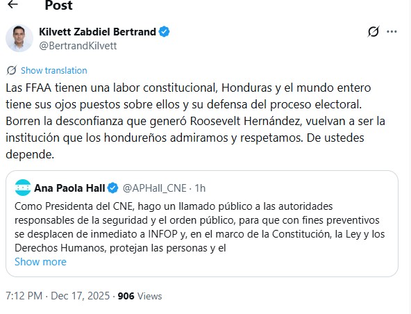 “Las Fuerzas Armadas tienen una labor constitucional. Honduras y el mundo entero tienen sus ojos puestos sobre ellos y su defensa del proceso electoral. Borren la desconfianza que generó Roosevelt Hernández y vuelvan a ser la institución que los hondureños admiramos y respetamos. De ustedes depende”, expresó Bertrand, al insistir en la necesidad de que la institución castrense recupere la confianza del pueblo hondureño.