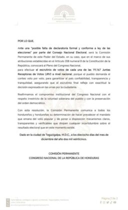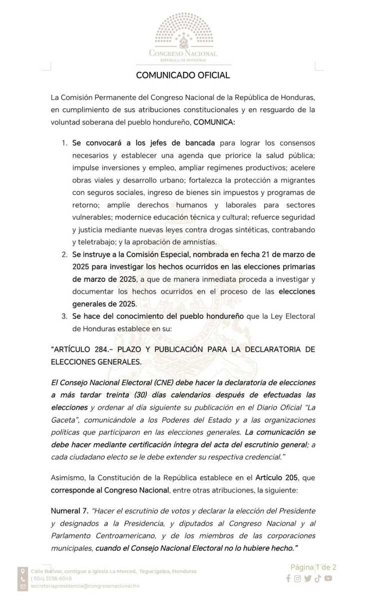 Tegucigalpa, Honduras. La Comisión Permanente del Congreso Nacional advirtió que, si el Consejo Nacional Electoral (CNE) no emite la declaratoria oficial de las elecciones generales dentro del plazo que establece la ley, el Legislativo procederá a realizar el escrutinio voto por voto y a declarar al presidente electo.