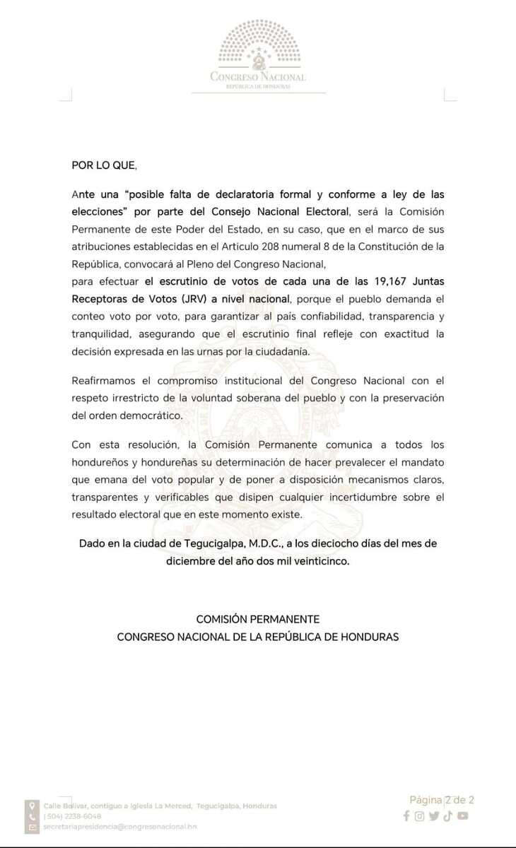 “El pueblo hondureño demanda un conteo transparente y confiable que refleje con exactitud la decisión expresada en las urnas”, leyó Redondo. A la vez, afirmó que esta acción busca brindar certeza, tranquilidad y credibilidad al proceso electoral.