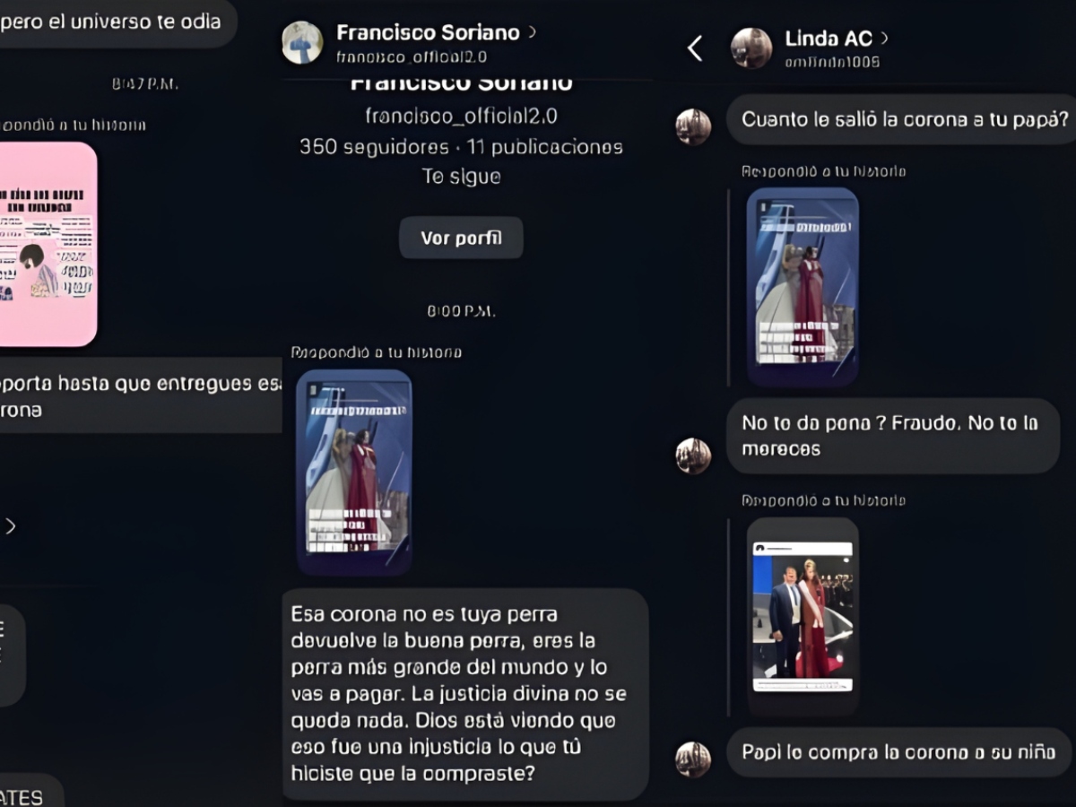 En otra captura, los mensajes son más agresivos: «Esa corona no es tuya perra, devuelve la buena perra, eres la perra más grande del mundo y lo vas a pagar. La justicia divina no se queda nada. Dios está viendo que eso fue una injusticia lo que tú hiciste, que la compraste».