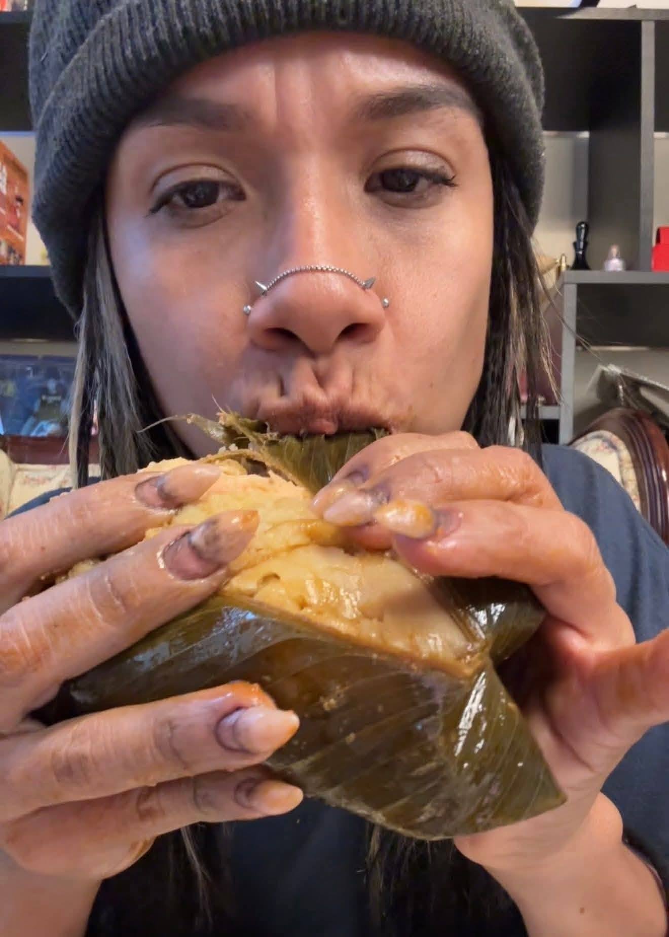 El video tiene más de 7 millones de reproducciones en TikTok y miles de comentarios de latinos que le expresaron que esa no es la manera de comerse un tamal, porque antes se le deben retirar las hojas de plátano.