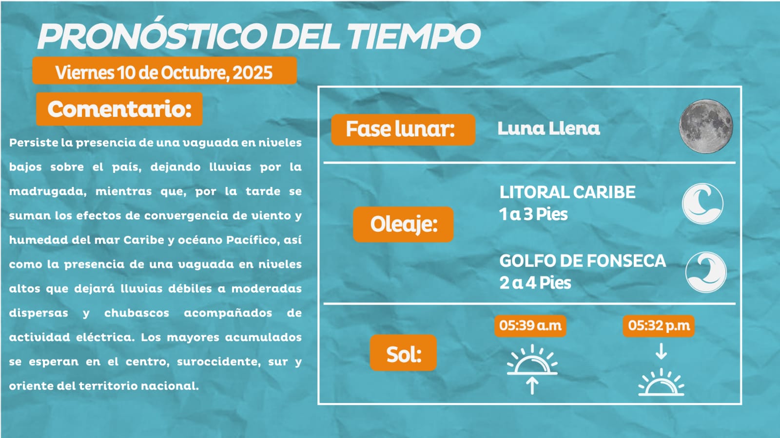 Redacción. El Centro de Estudios Atmosféricos, Oceanográficos y Sísmicos (Cenaos) dio a conocer el pronóstico del clima para este viernes 10 de octubre de 2025.