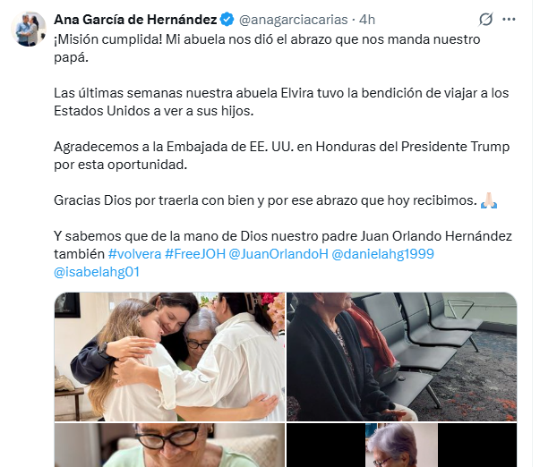 Además, las hijas del expresidente expresaron su profundo agradecimiento a Dios y a las autoridades estadounidenses competentes por haber facilitado el viaje que permitió el emotivo reencuentro entre la madre y sus dos hijos.