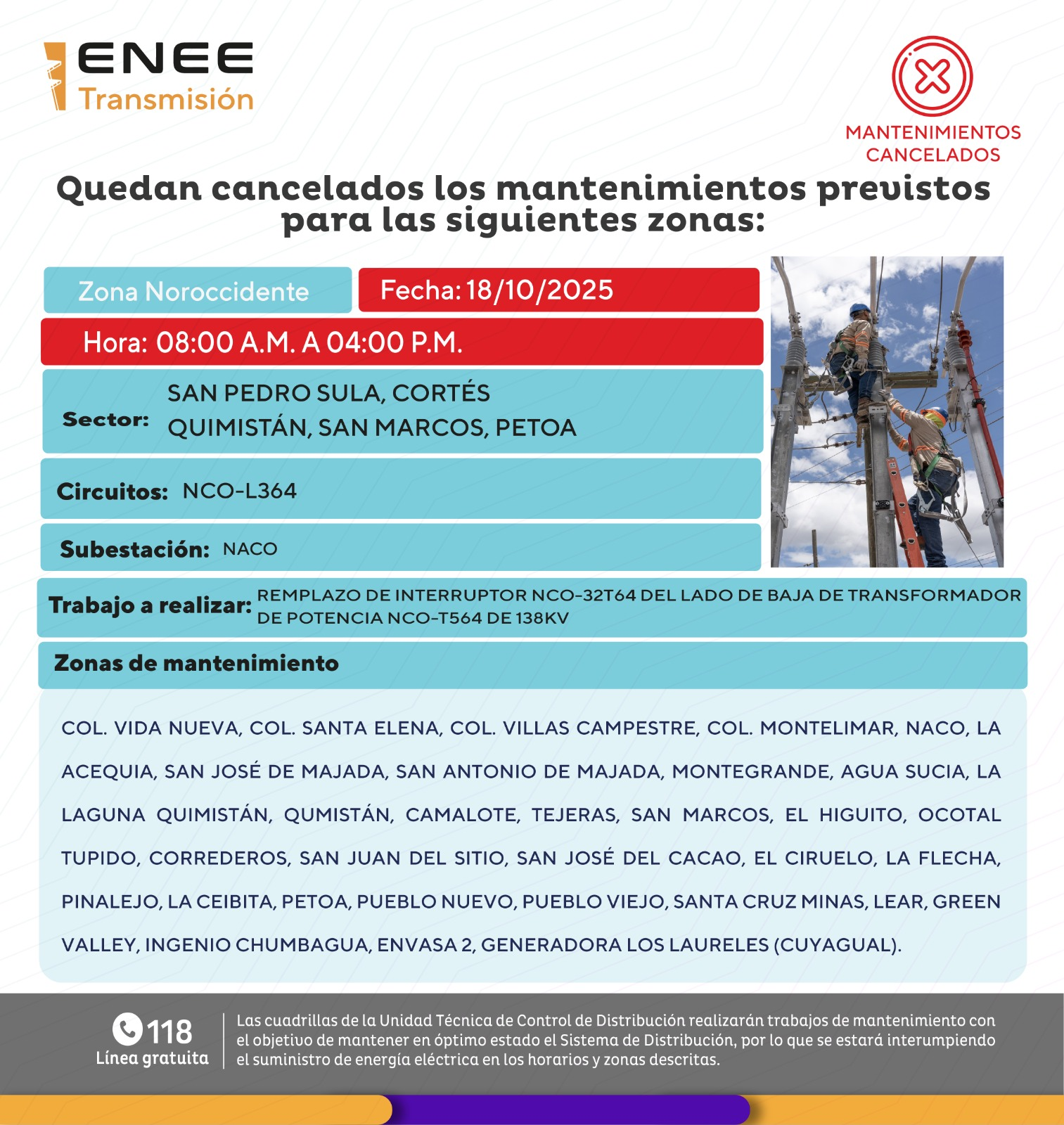 Según el comunicado oficial de la estatal, se suspenderán los trabajos de mantenimiento que estaban programados en los municipios de Quimistán, San Marcos y Petoa, en el departamento de Santa Bárbara, así como en San Pedro Sula, en el departamento de Cortés.