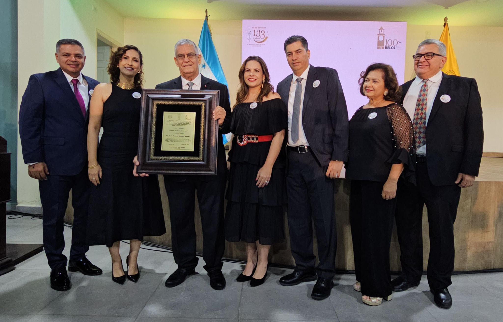 «En nombre del pueblo progreseño, en el marco del 133 aniversario de fundación de El Progreso y en conmemoración del Primer Centenario de nuestro reloj del Parque Ramón Rosa, se honra en entregar la ‘Orden Guillermo Jaime Baín’ Edición 2025 al distinguido ciudadano ingeniero Juan Antonio Bendeck Bendeck», reza la placa del reconocimiento.
