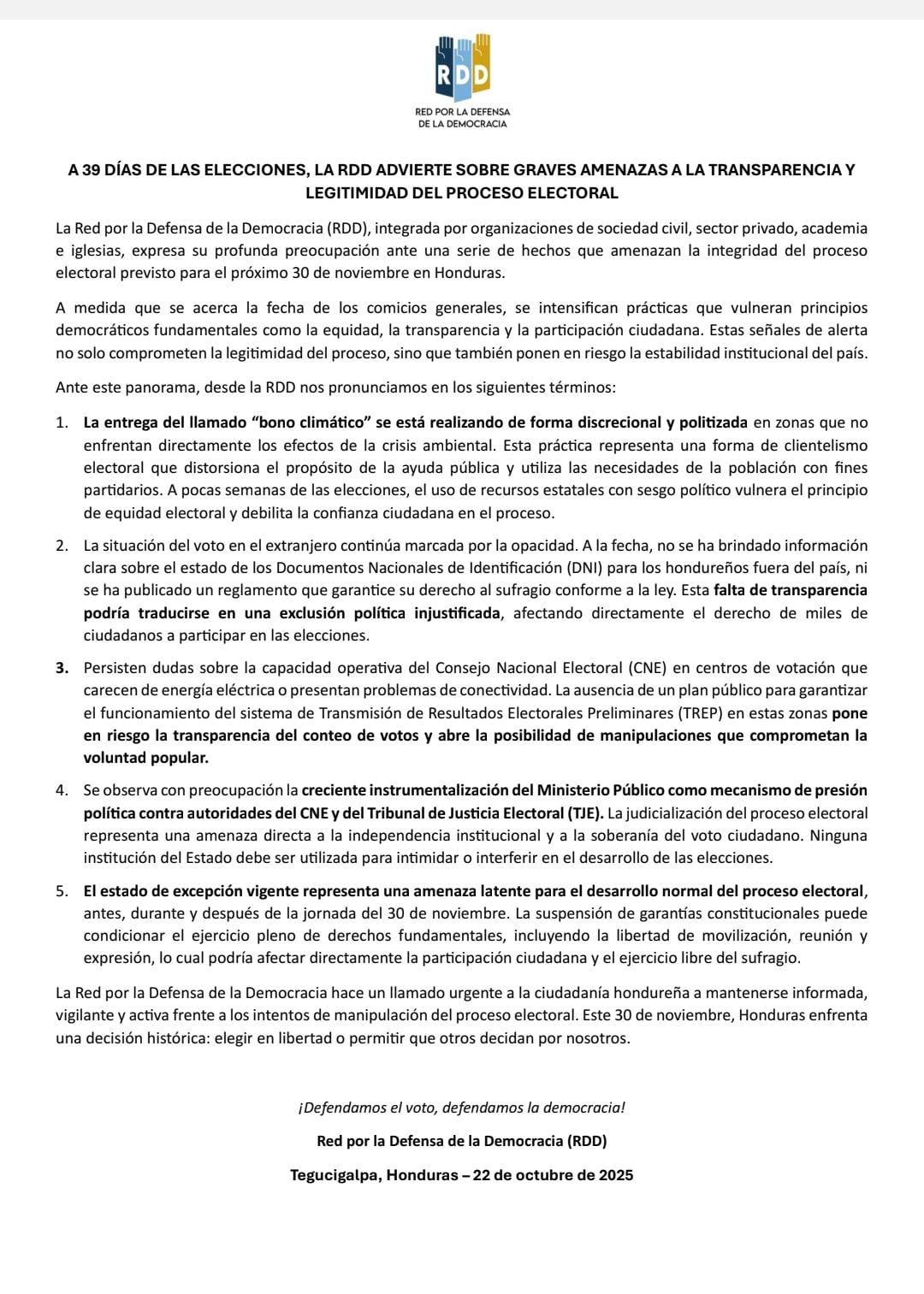 Redacción. La Red por la Defensa de la Democracia (RDD) expresó este miércoles su creciente preocupación por las amenazas a la transparencia y legitimidad del proceso electoral para las elecciones generales programadas para el 30 de noviembre.