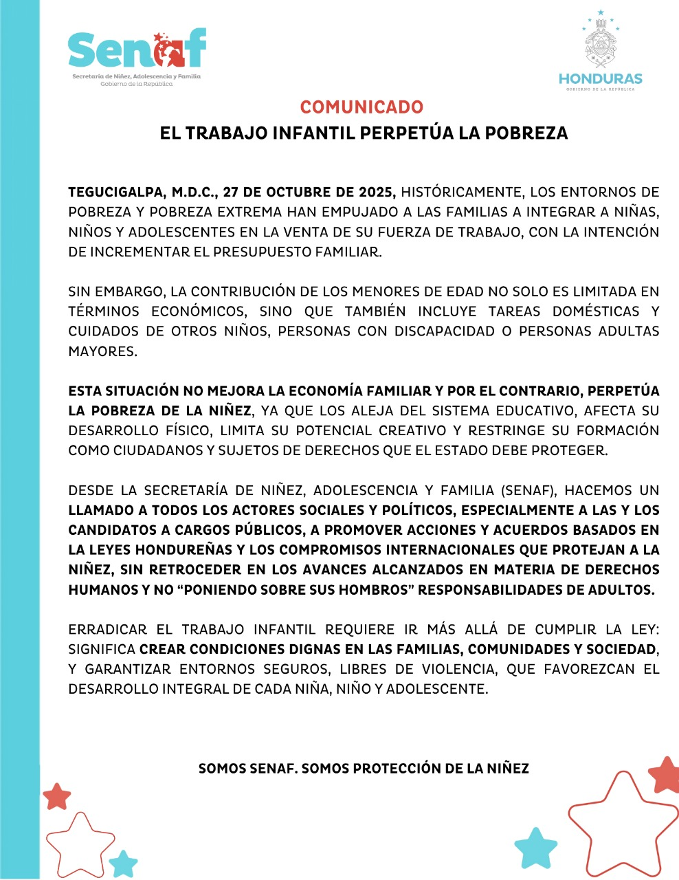 Asimismo, la Secretaría realizó un llamado a todos los actores sociales y políticos, especialmente a las y los candidatos a cargos públicos, a promover acciones y acuerdos basados en las leyes hondureñas y en compromisos internacionales que protejan a la niñez, sin retroceder en los avances alcanzados en materia de derechos humanos.