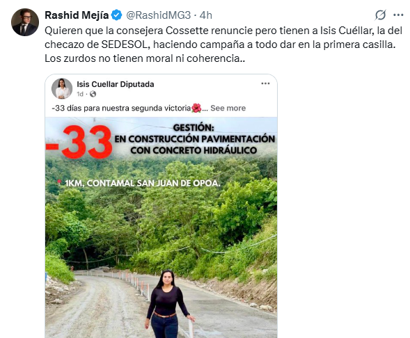 “Quieren que la consejera Cossette renuncie, pero tienen a Isis Cuéllar, la del ‘checazo’ de Sedesol, haciendo campaña a todo dar en la primera casilla. Los zurdos no tienen moral ni coherencia”, expresó a través de su cuenta en X.
