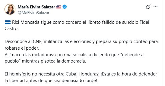 En un mensaje publicado en su cuenta oficial de X, Salazar acusó a Moncada de seguir un “libreto fallido” inspirado en el dictador cubano Fidel Castro, asegurando que la candidata de Libre está sentando las bases para una posible dictadura en Honduras.