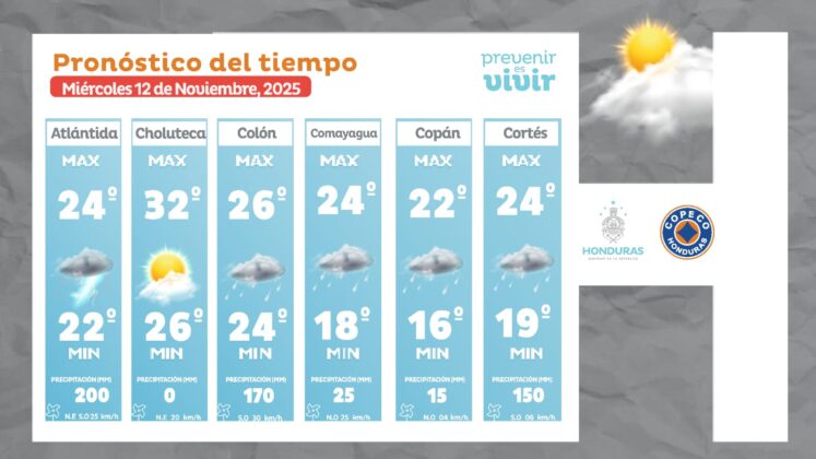 - Choluteca: 32° como máximo, 26° como mínima (0 milímetros).