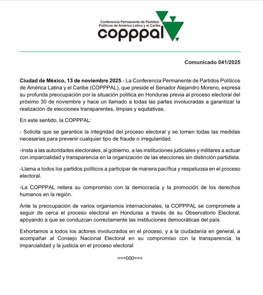 Redacción. La Conferencia Permanente de Partidos Políticos de América Latina y el Caribe (COPPPAL), presidida por el senador Alejandro Moreno, expresó su profunda preocupación por la situación política en Honduras de cara a las elecciones generales.