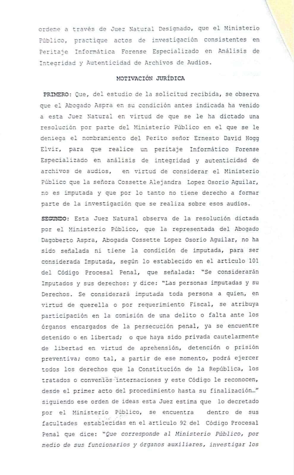 «Dicen que mi representada no figura como investigada en el caso de los audios, por lo que no podemos solicitar este medio de prueba. Esta decisión forma parte de la articulación entre el partido Libre y el Ministerio Público, y ahora la Corte la replica, impidiéndonos desenmascarar irregularidades», manifestó el togado en entrevista para un medio local.