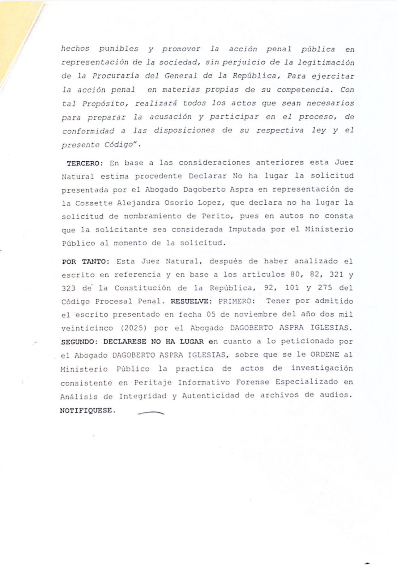 La solicitud de la defensa buscaba que se autorizara un peritaje especializado en análisis de integridad y autenticidad de los archivos de audio, así como la designación y juramentación de un perito informático forense.