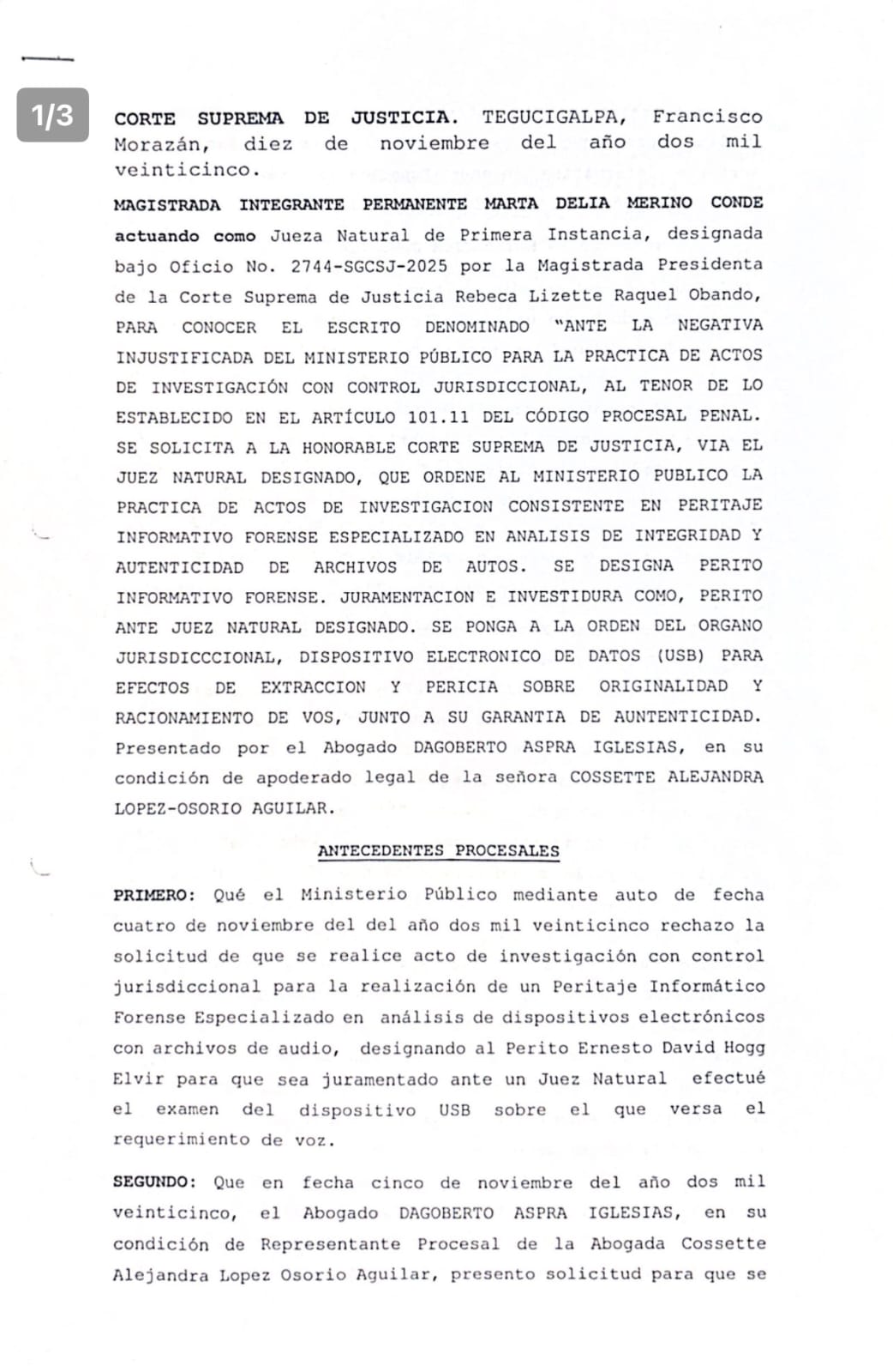 La solicitud de peritaje presentada por la defensa ante la CSJ se dio luego de que el ente acusador rechazara realizar un peritaje informático forense sobre los audios que presuntamente comprometen a la consejera.
