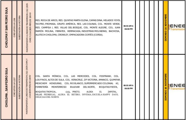 Los cortes afectarán varios sectores urbanos y rurales, especialmente en el departamento de Cortés. En Choloma y San Pedro Sula, diversos barrios y colonias permanecerán sin energía desde las 06:00 de la mañana hasta las 06:00 de la tarde.