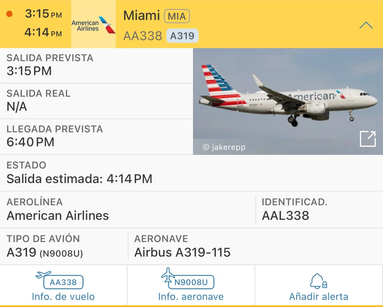 El vuelo de American Airlines que debía salir a las 3:15 p.m. con rumbo a Miami ahora saldrá a las 4:14 p.m.