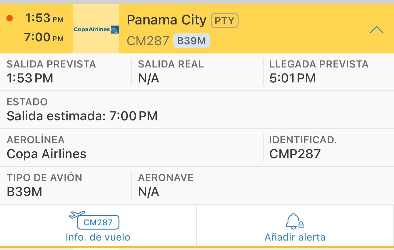El avión de Copa Airlines (vuelo CM 287) con destino a Ciudad de Panamá iba a salir a la 1:53 p.m. y ahora saldrá a las 7:00 p.m.
