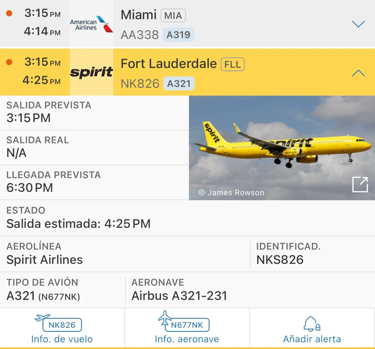 El avión de Spirit Airlines con número de vuelo NK 826 iba a salir para Fort Lauderdale a las 3:15 p.m. y ahora saldrá a las 4:25 p.m.