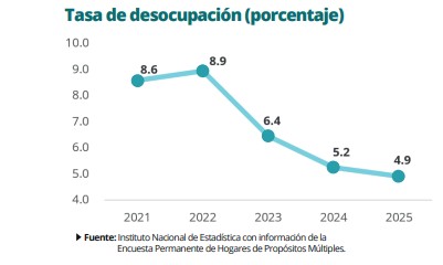 Según el INE, la tasa de desocupación se redujo de 8.6 % en 2021 a 4.9 % en 2025. Únicamente en 2022 se registró un pequeño incremento de 0.3 puntos, siendo el único año de la serie que refleja un retroceso.