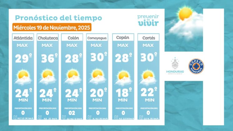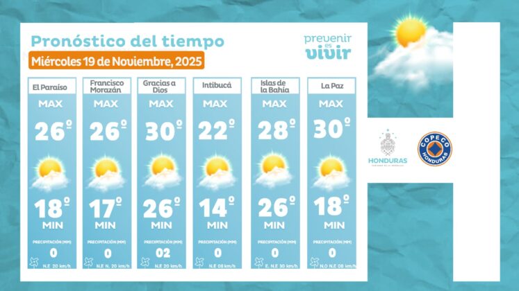 - Tegucigalpa: 26° como máximo, 17° como mínima (0 milímetros).