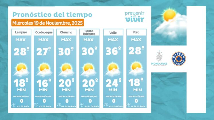Redacción. El Centro Nacional de Estudios Atmosféricos, Oceanográficos y Sísmicos (Cenaos) dio a conocer el pronóstico del tiempo para este miércoles 19 de noviembre, anticipando un escenario dominado por condiciones secas en la mayor parte del territorio nacional.
